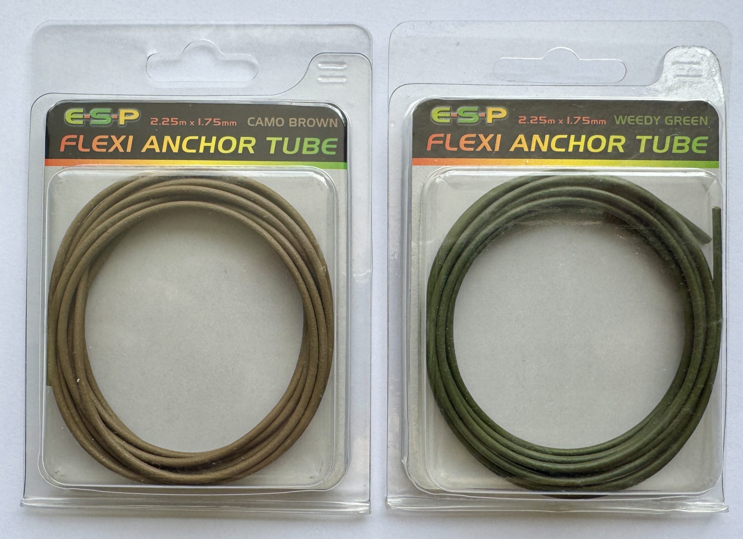 Flexi Anchor Tubing, It is available in two colours: Camo Brown and Weedy Green to help disguise and conceal the tubing. Being more supple and flexible than the ESP original Anchor Rig Tube, this material hugs the bottom, and follows its contours more like a Leadcore Leader. Whereas it can be cut down to any desired length, the 2.25metres conveniently produces the 0.75 metre sections, a popular standard length for tubing. The material is extra-tough and slightly elastic so it can be stretched out to remove any coiled memory. With a central bore of 0.65mm which is big enough to accommodate heavy reel lines or shock leaders, but fine enough to leave little room for trapped air in the tube. To thread thicker lines it is best to cross-cut the mono on an angle, with good quality scissors. Comparison table:
