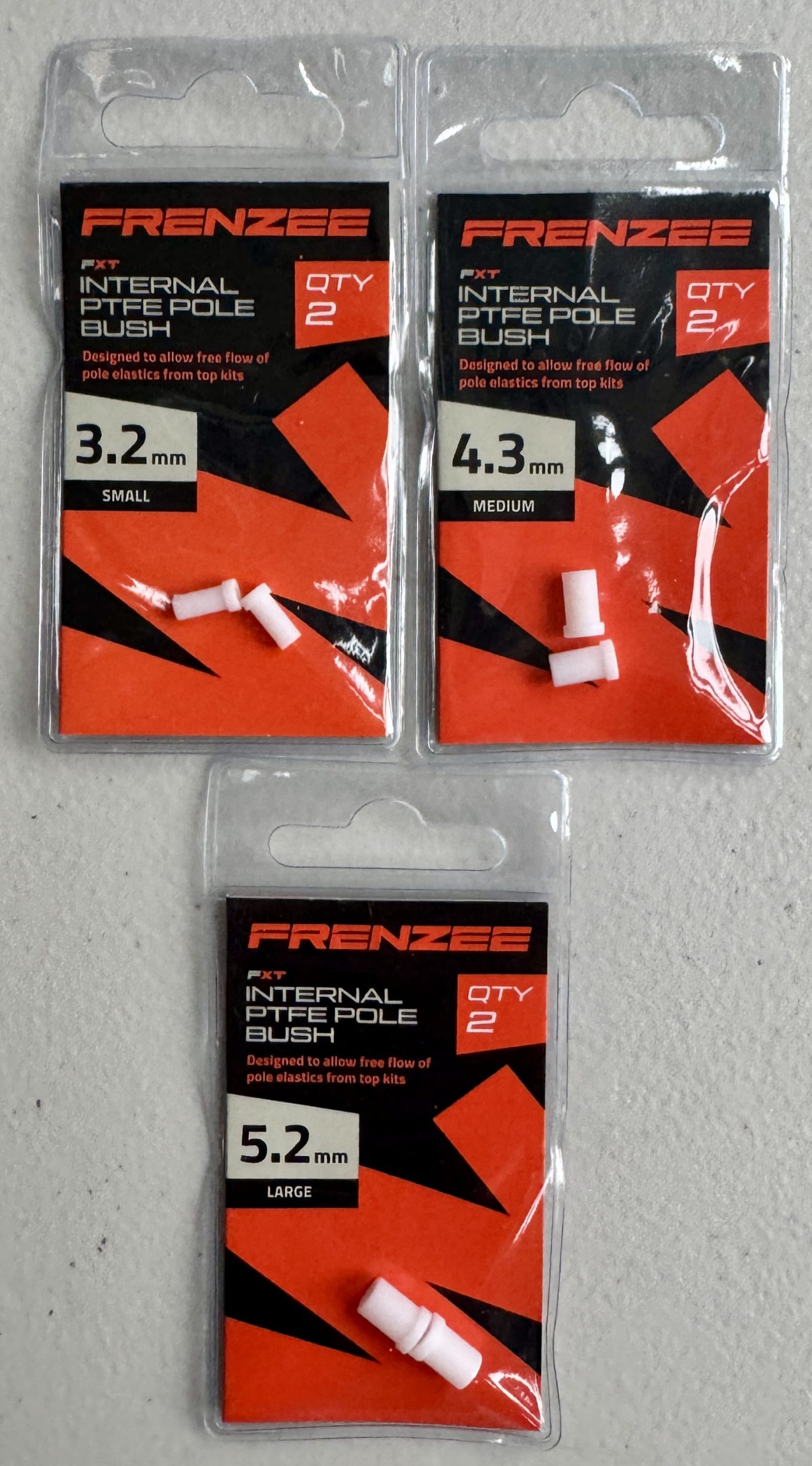 FXT Internal PTFE Bushes are designed to allow free flow of pole elastics from top kits, with a chamfered bore to reduce friction and wear on elastics. Made from high quality PTFE for superior elastic flow and available in small, medium and large sizes. Pack of 2.