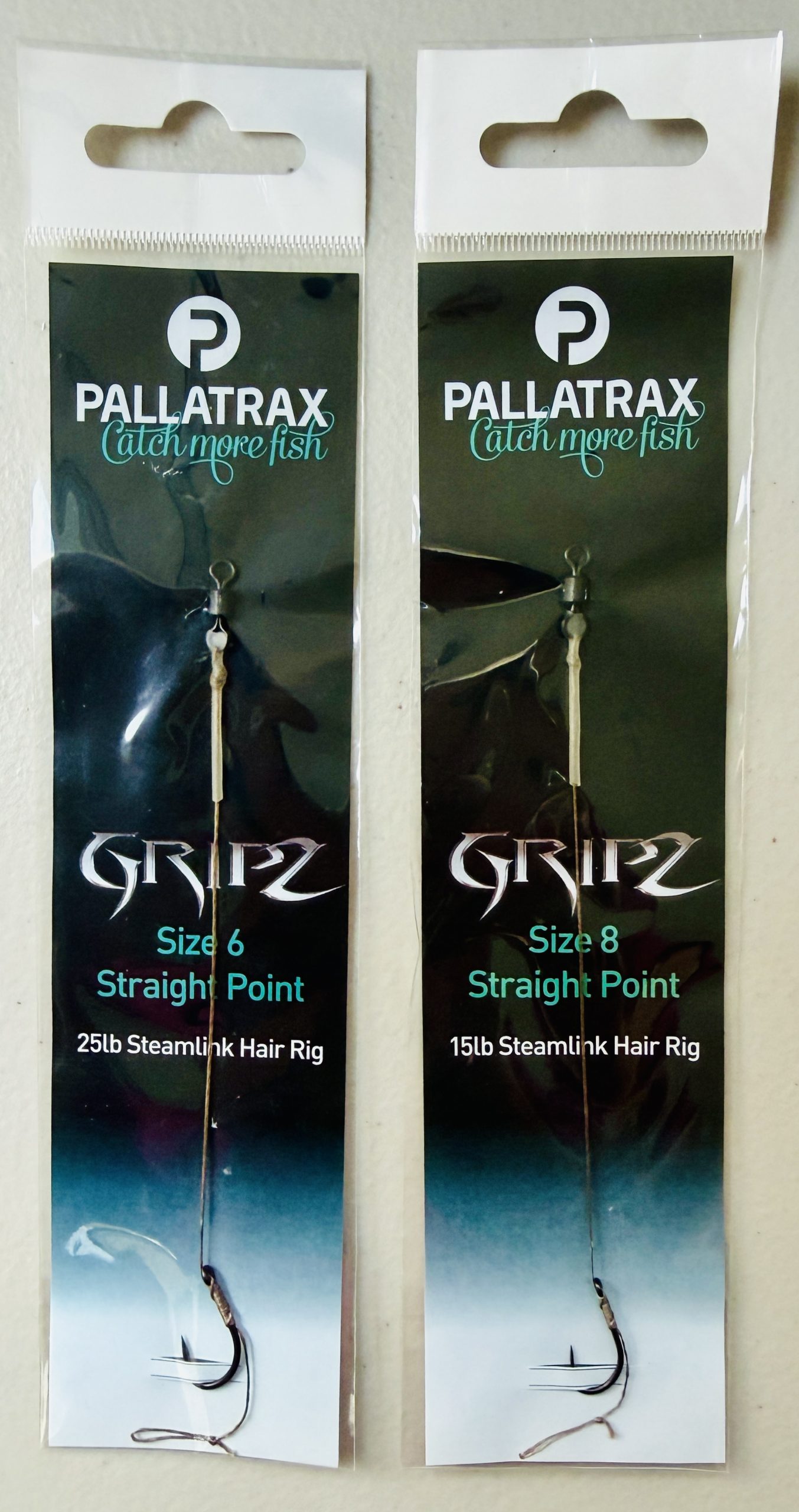 These Pallatrax Gripz Straight Point Steamlink Hair rigs are available in size 6 and 8. The rigs are part of Pallatrax’s range of 4” long hand-tied hair rigs. They feature a totally new hook design with unique grooves that give a firm hook hold under pressure.