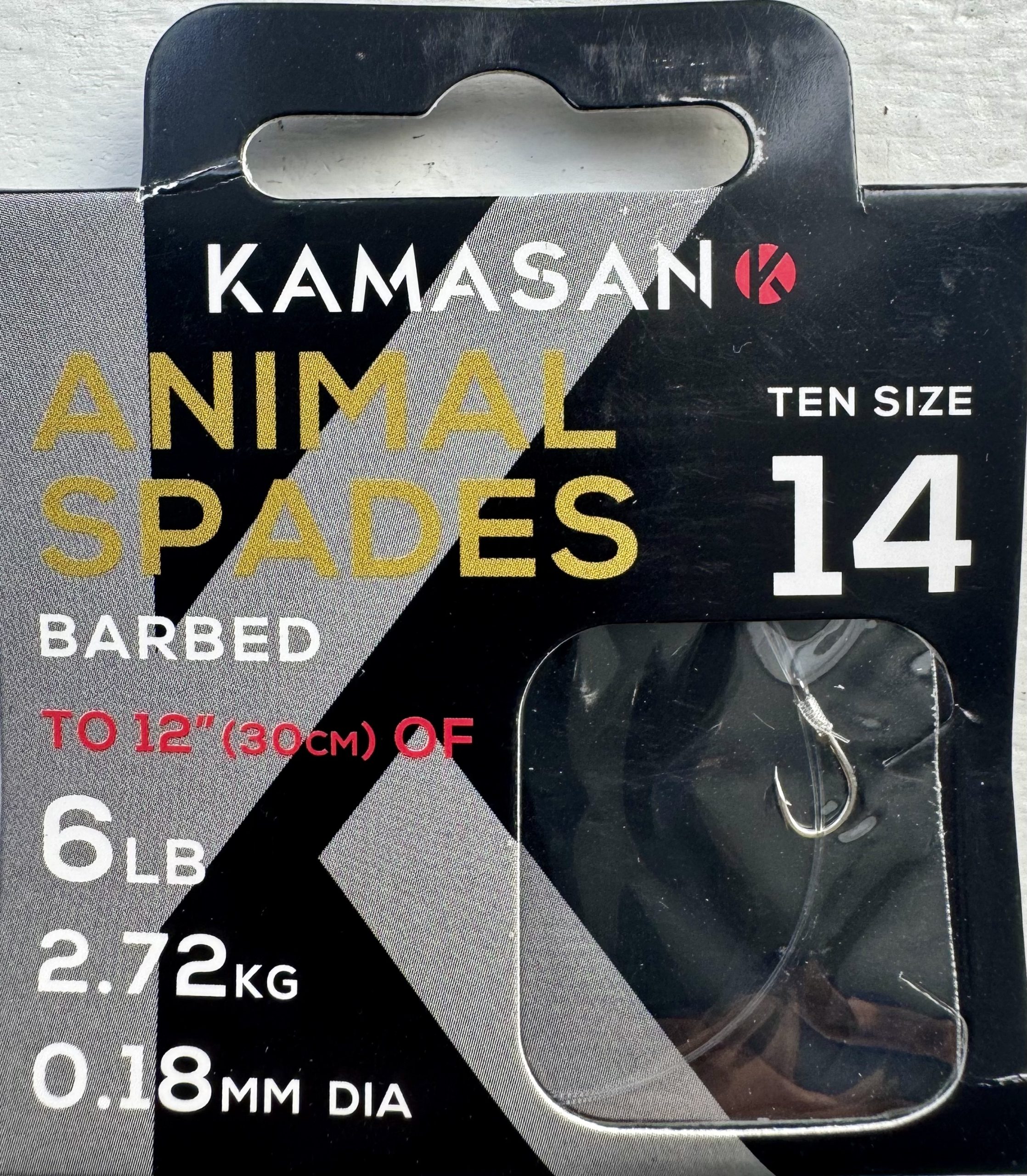 10 pack of Kamasan Animal Spades Hooks to Nylon (HTN) Barbed size 14 tied to 12″ (30cm) of 6lb 2.72kg 0.18mm Diameter line.