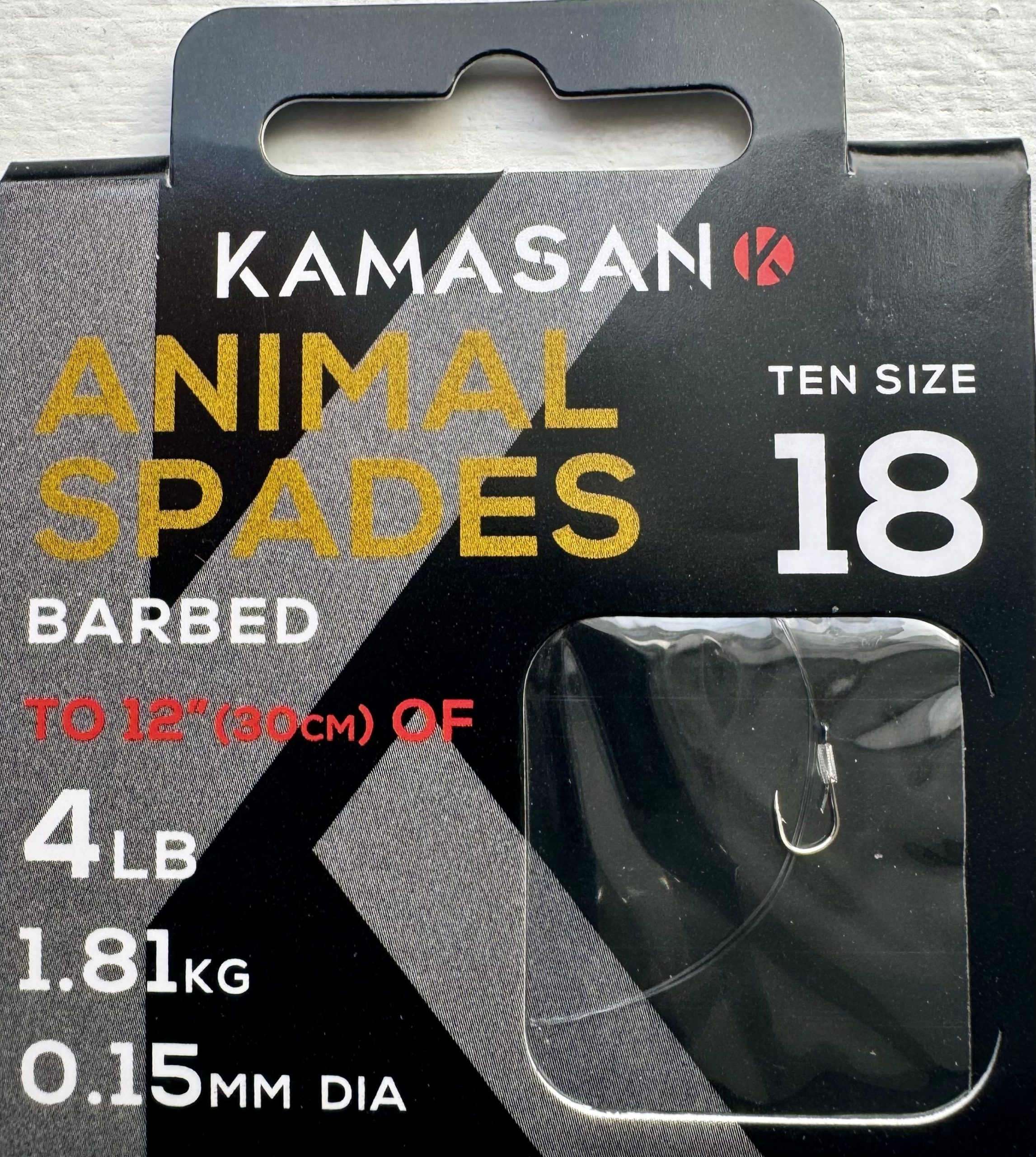 10 pack of Kamasan Animal Spades Hooks to Nylon (HTN) Barbed size 18 tied to 12″ (30cm) of 4lb 1.81kg 0.15mm Diameter line.