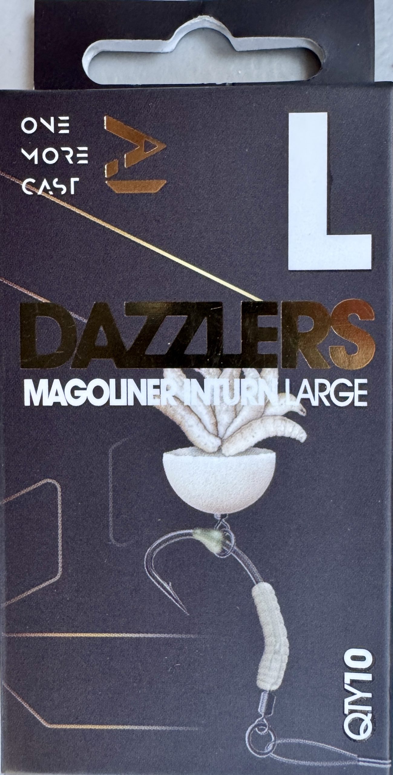 When the final pieces are needed to complete the ultimate jigsaw. The Dazzlers range is all about the intricate details that transform the ordinary to brilliant. Like a perfect WHITE Maggot The MAGOLINER Inturn forms a STIFF aggressive angle around the eye of the hook to create very effective hooking mechanics for your Rig. The perfect compliment for the Spinner Rig or any rig where you want to improve your chances of hooking and landing pressured fish.